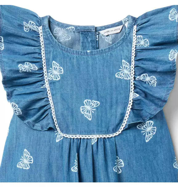 Our classic chambray dress sets hearts aflutter with its butterfly print, flutter sleeves and loop trim. Just add a sunny day.