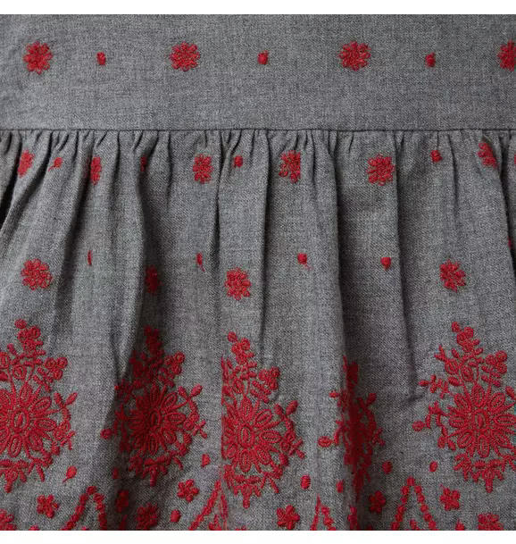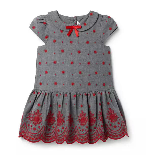 Designed with details to remember, our dropwaist dress features intricate floral embroidery, a scalloped hem and a bow-tied Peter Pan collar.
