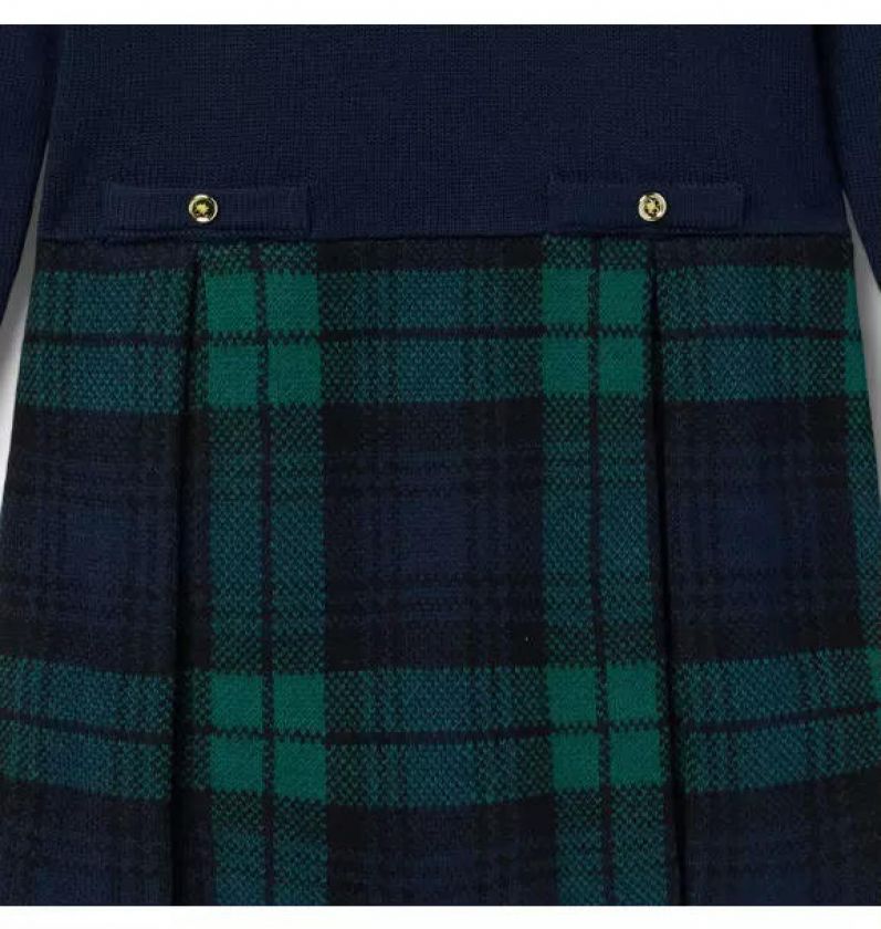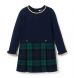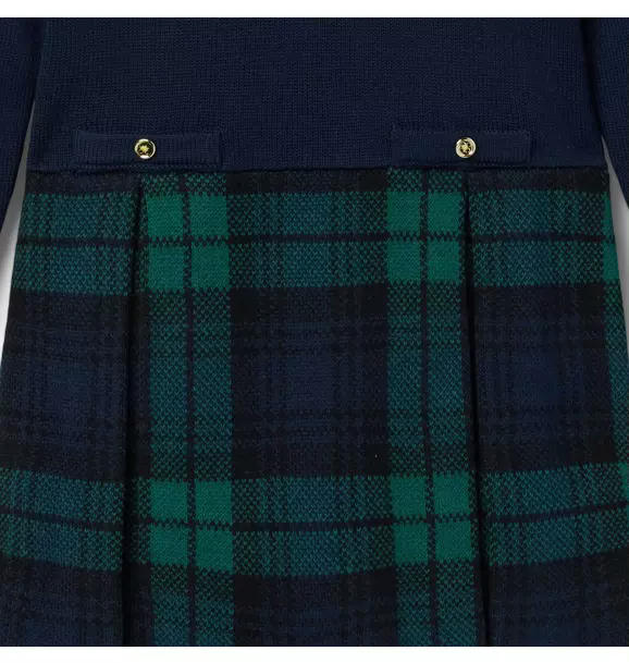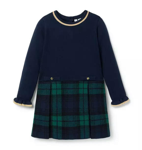 As cozy as it is stylish, our sweater dress is a favorite all season long. With a cozy knit top featuring ruffle cuffs and contrast trim, plus button details and a classic pleated tartan skirt in soft jacquard.