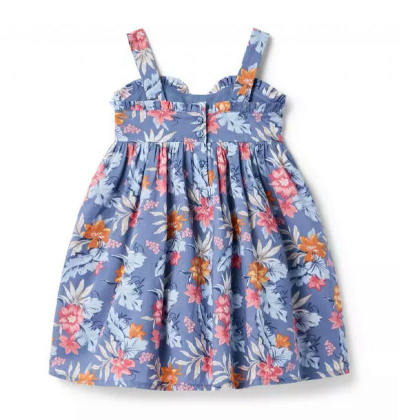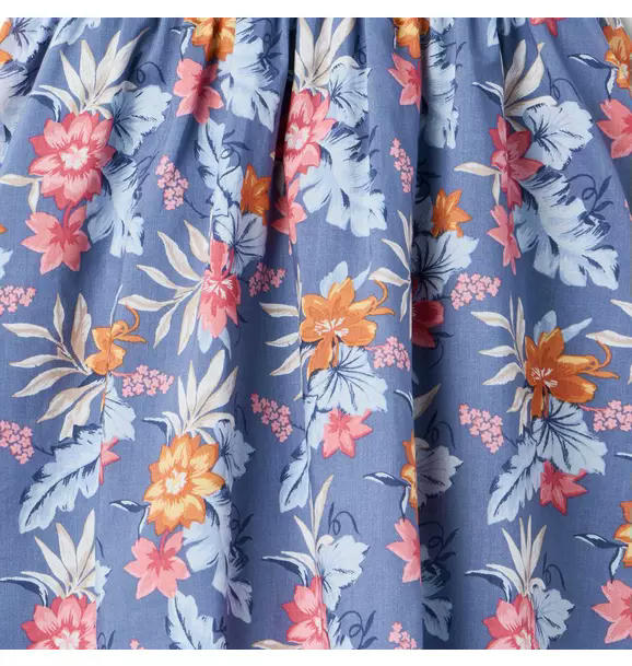 Trending tropical florals for this sunny day favorite. In pure cotton with an empire waist, sweetheart neckline and ruffle details too.