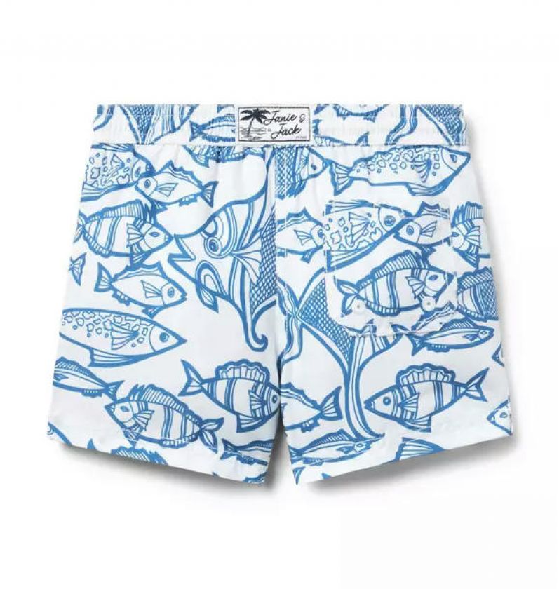 It’s a sea of style with our fish print swim trunk. Featuring UPF 50+ sun protection, a touch-close back pocket and embroidered eyelets to let water drain out. Responsibly made with recycled fabric.