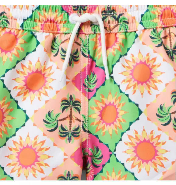 A mosaic-inspired swim trunk that’s ready for getaways. Featuring a palm tile print, UPF 50+ sun protection, plus a touch-close back pocket with embroidered eyelets to let water drain out. Responsibly made with recycled fabric.
