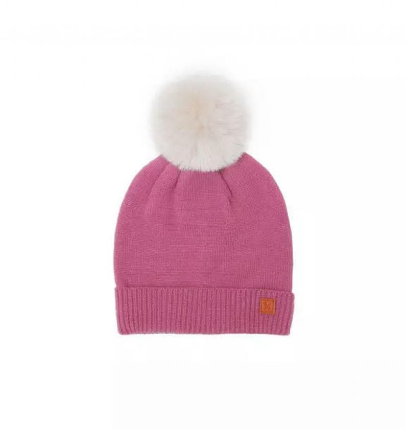 Rose Pink Knit Winter Hat with Faux Fur Pom
