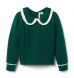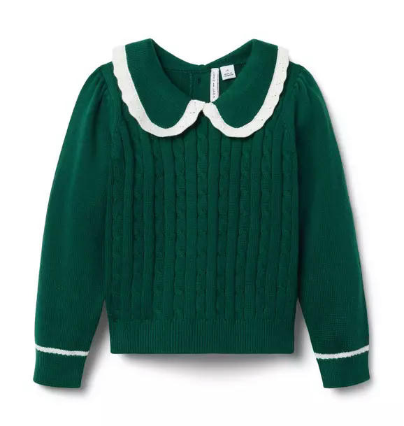 Our cable knit sweater adds a cozy touch to any look. With crochet lace trim at the collar and contrast stripes at the cuffs.