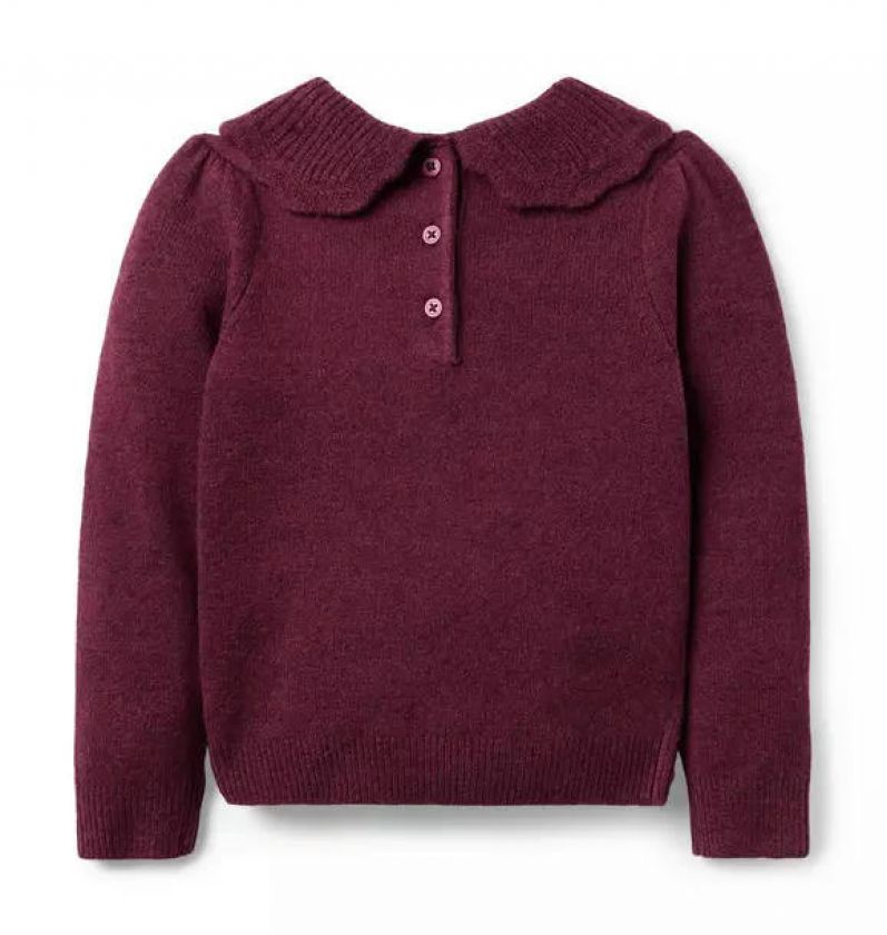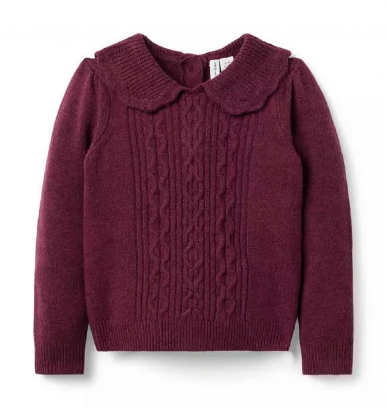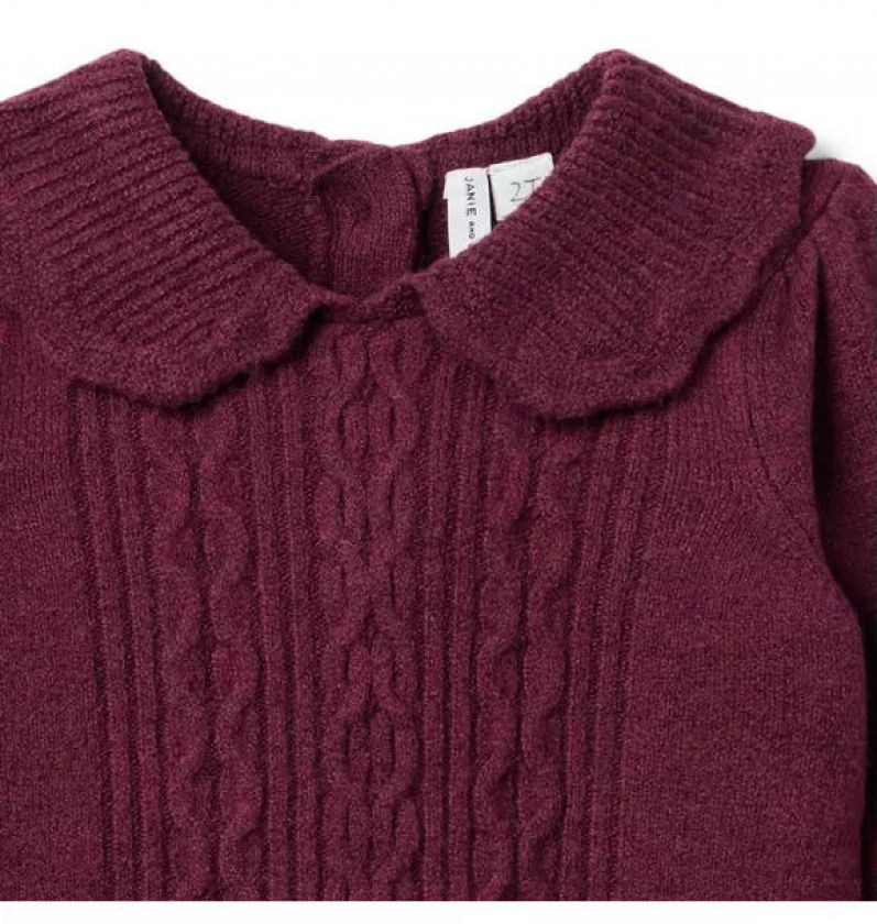 Our cable knit sweater adds a cozy touch to any look. With crochet lace trim at the collar and contrast stripes at the cuffs.