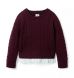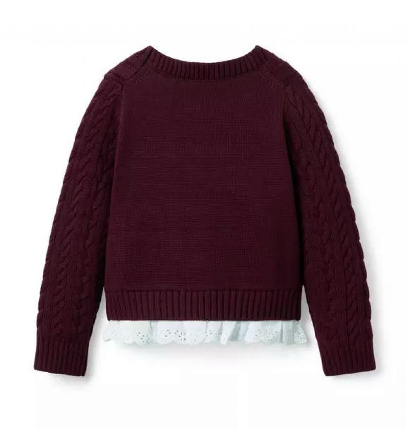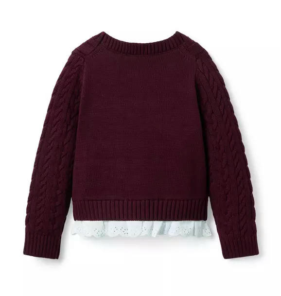 An eyelet ruffle hem adds a fashionable twist to this sweater. In soft cotton with cable knit details.