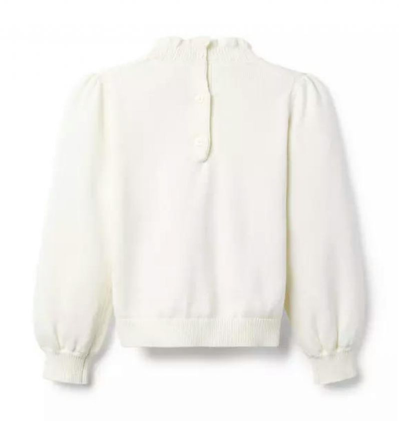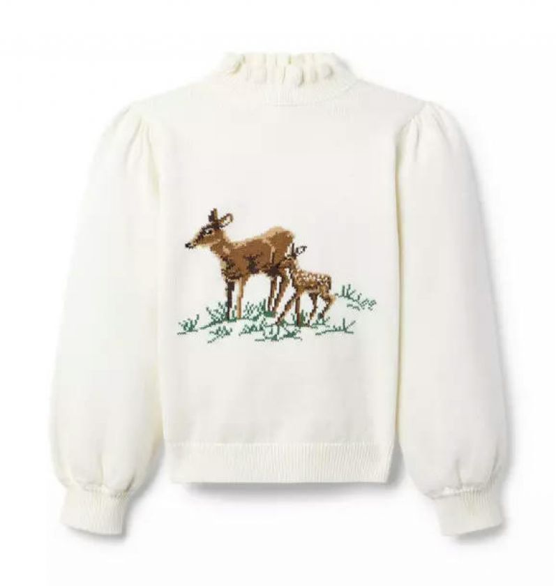 A sweater stitched with deer friends. Soft and cozy with ribbed details and a scallop- trimmed turtleneck.