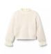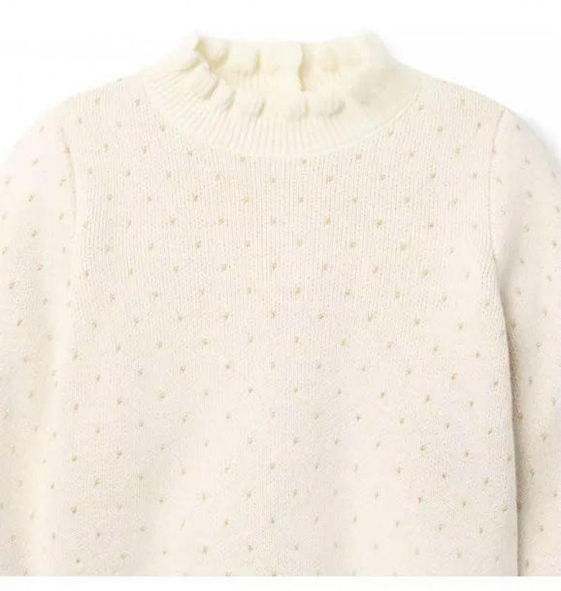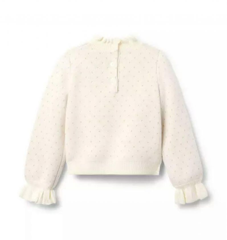 Style is spot on in our dot sweater. With hints of sparkle, ribbed details and ruffles at the collar and cuffs.