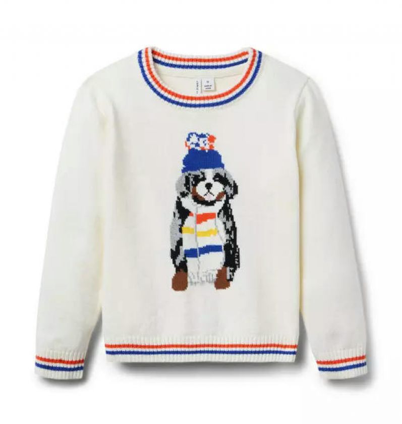 Sweater weather is snow much fun in our limited edition sweater. Oh-so-soft and cozy with an intarsia-knit dog friend and ribbed striped details, it's ready for every adventure.