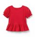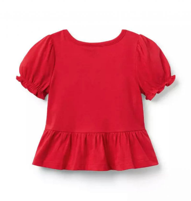 Rows of bows for this favorite in soft cotton jersey. With puff sleeves, a peplum hem and ruffle cuffs for extra frills.