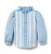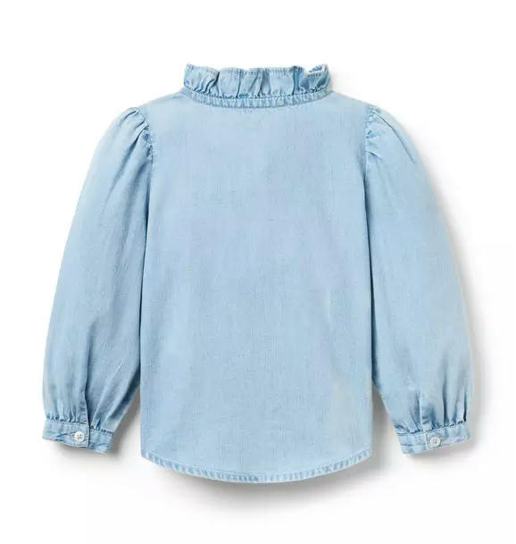 Our chambray top gets a fashionable twist with lace details. A ruffle collar makes it even better.