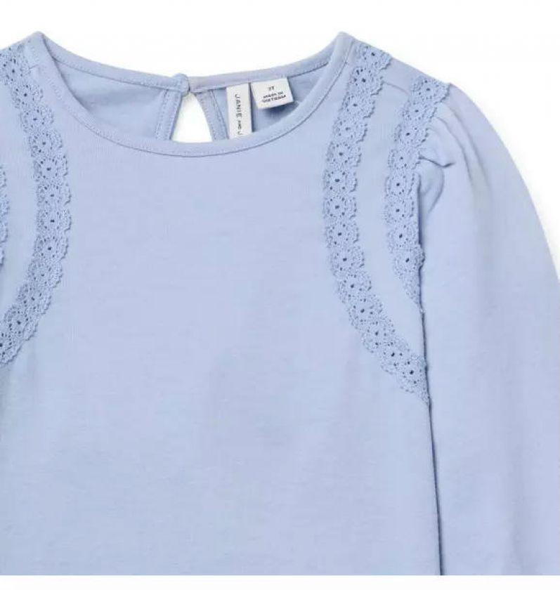 Our soft jersey top gets a stylish twist with crochet lace trim. Plus, ruffle cuffs for extra frills.