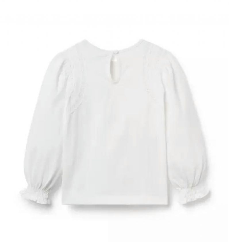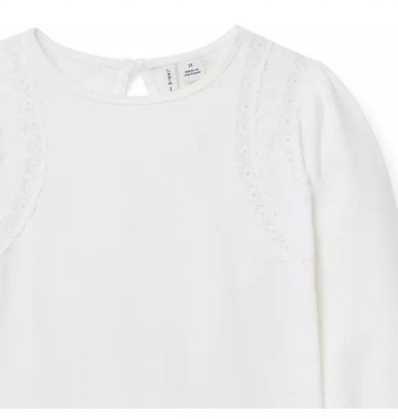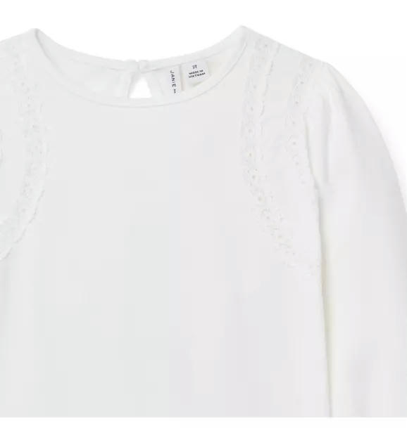 Our soft jersey top gets a stylish twist with crochet lace trim. Plus, ruffle cuffs for extra frills.