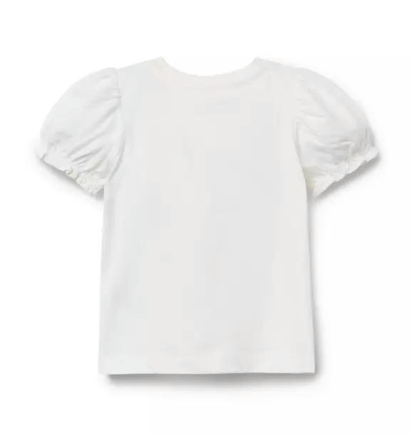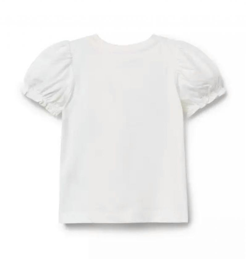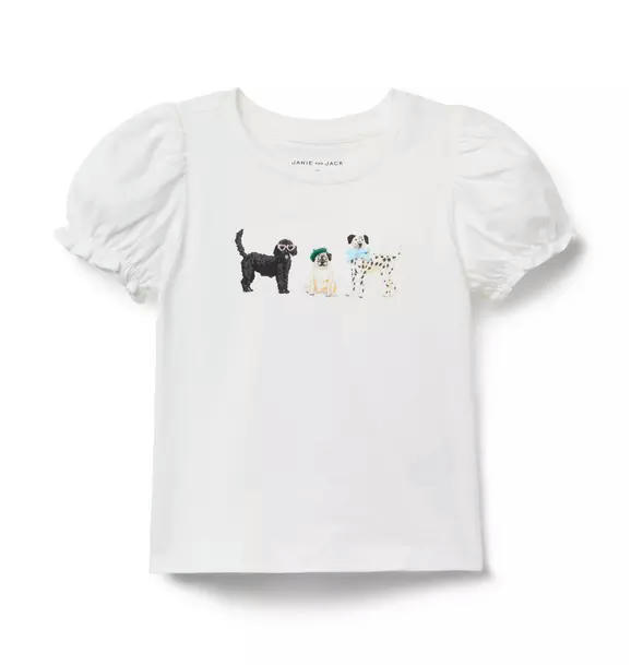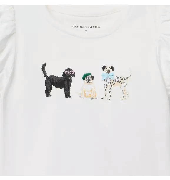 Their wardrobe's new best friend. With puff sleeves, ruffle cuffs, a screenprinted dog friends design and embroidered details.