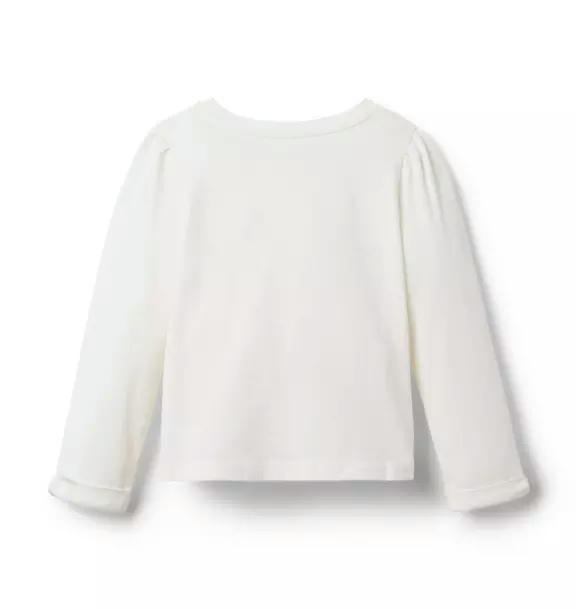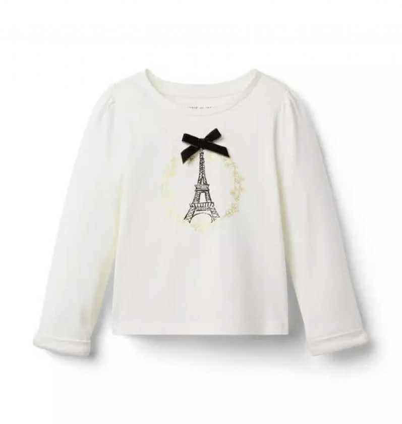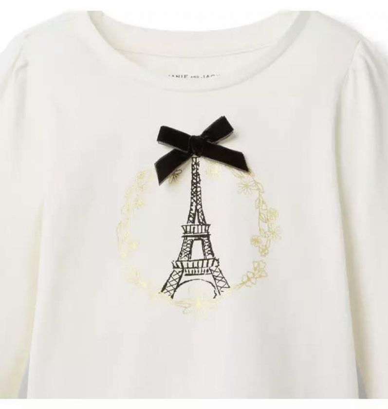 Style inspiration from Paris, all tied up with a bow. Our puff sleeve tee features an Eiffel Tower graphic, metallic details and a velvet bow too.