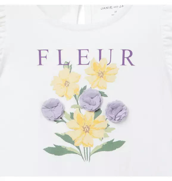 Style blossoms with our tee in soft cotton jersey. With a screenprinted graphic, 3D floral applique details and ruffle sleeves.
