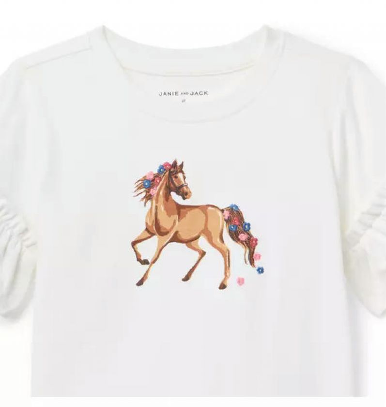 Showcase their style with our ruffle sleeve tee in soft cotton jersey. Featuring a screenprinted horse graphic with embroidered flowers.