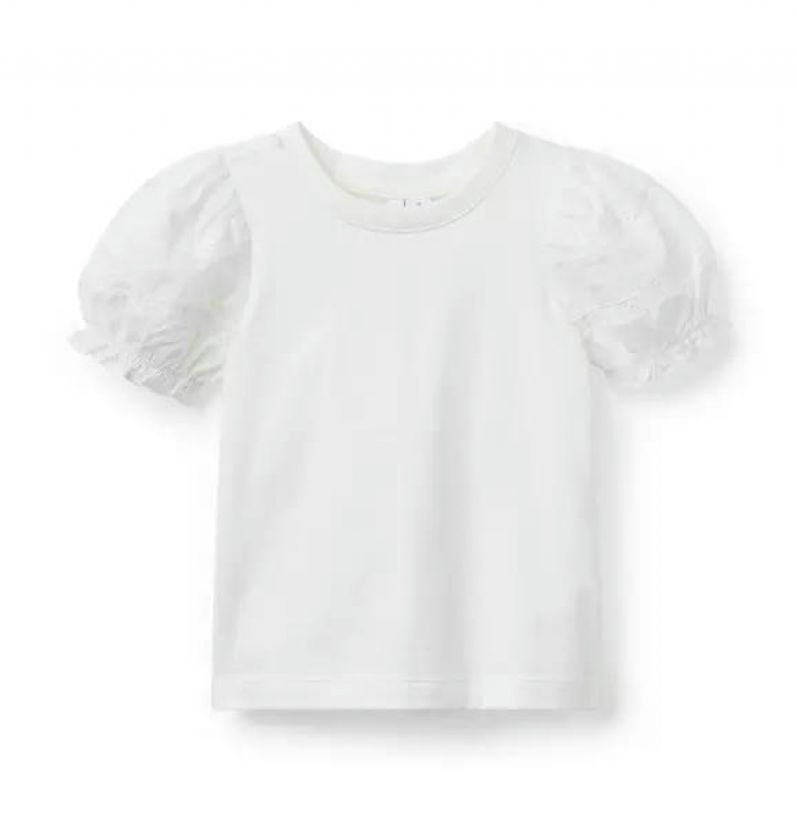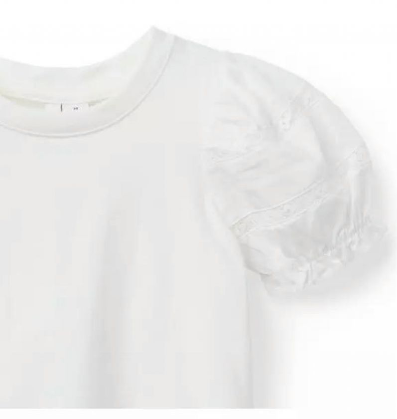 Wear your style on your sleeve. Our soft jersey top features puff sleeves with lace details and ruffle cuffs too.