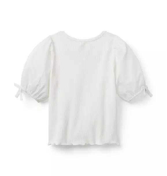 Puff sleeves add something special to our ribbed top. Plus, bow details, a ruffle hem and a stylish scoop neck too.