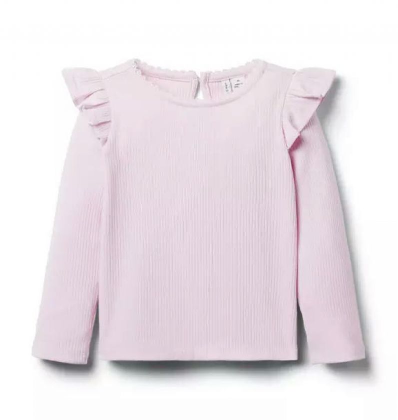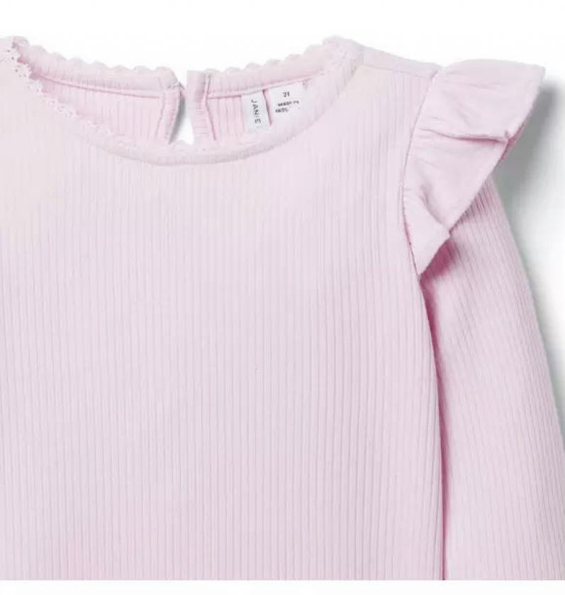 Our classic ribbed top gets an upgrade with ruffled shoulders and scalloped crochet lace at the neckline. It effortlessly pairs with all their favorites.