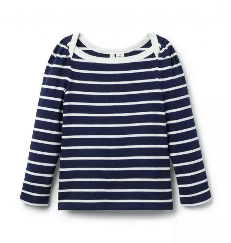 A classic that's always in our lineup. Designed with a boat neck, puff sleeves and allover stripes.
