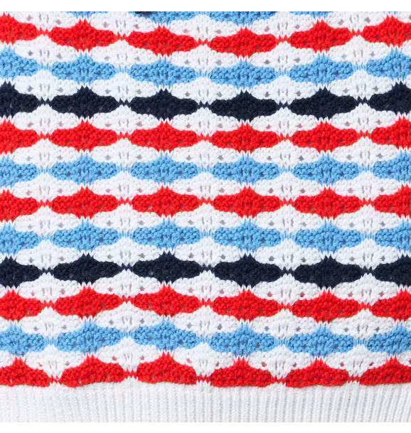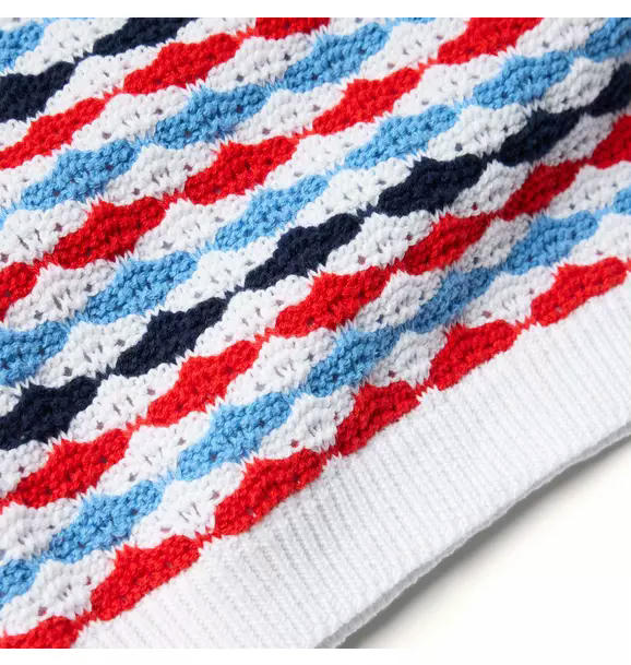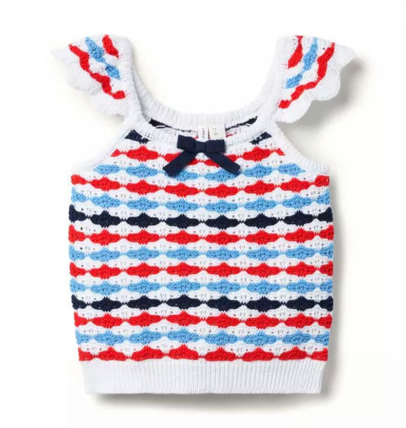 A parade of details for this Americana-inspired top. Designed in allover crochet with red, white and blue stripes. Plus, scalloped flutter sleeves and a bow at the front.