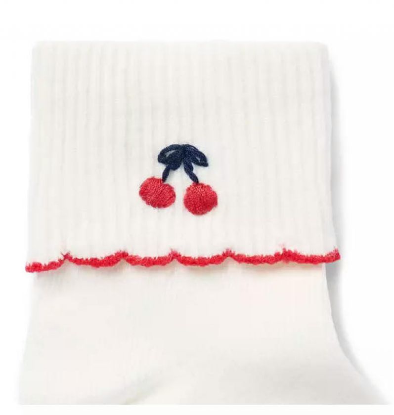 Every look is extra sweet with our soft foldover sock. Featuring an embroidered cherry detail and contrast scalloped cuff, it's perfect for tiny toes.