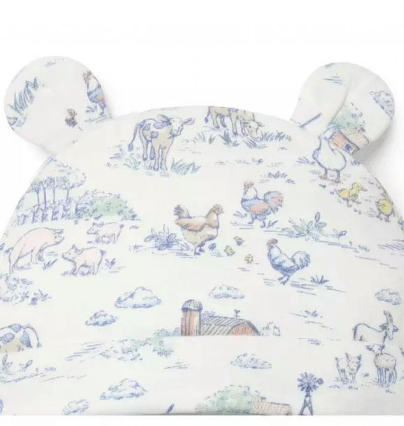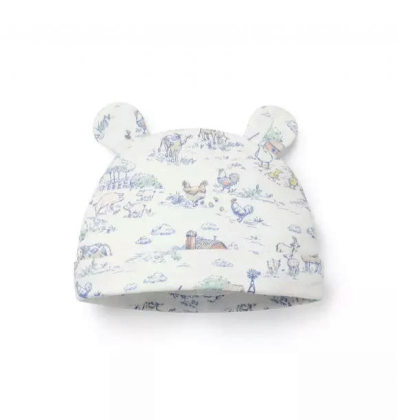 Welcome baby in our soft bear ear beanie. We love its farm animal friends toile and foldover detail for extra coziness.