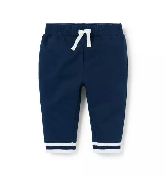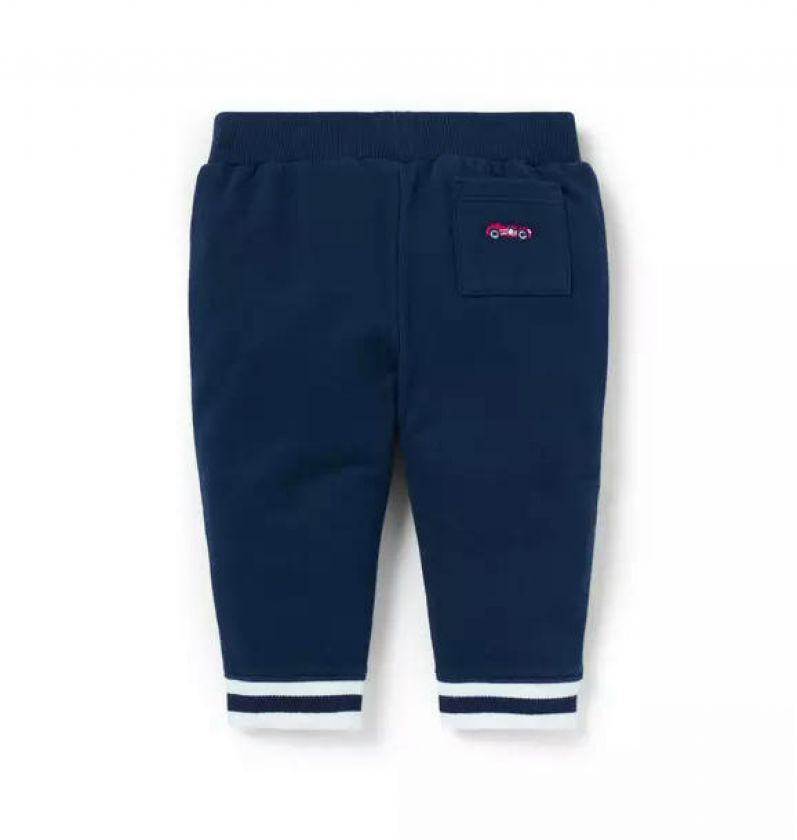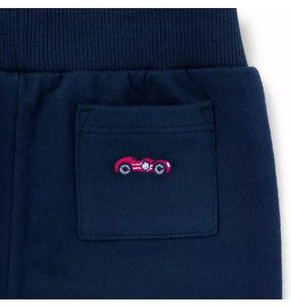Our soft French terry jogger is perfect for cozy moments or first adventures. With ribbed striped cuffs and an embroidered race car detail at the back pocket.