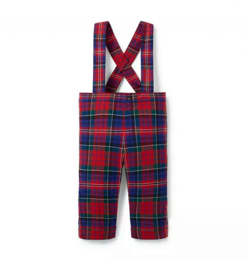 Festive tartan and soft twill—baby's first holiday look is all set with our classic suspender pant. Finished with cuffed details and little back pockets.