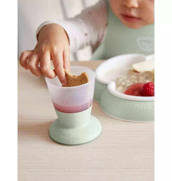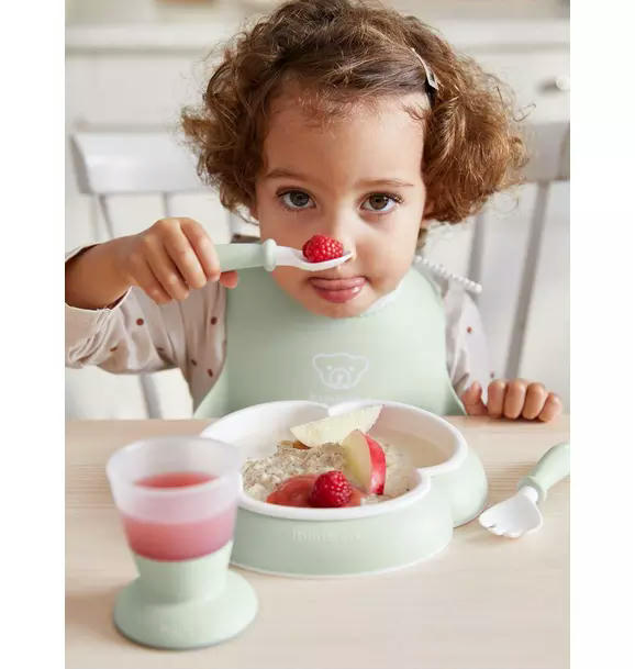 Our kitchen products have cleverly designed details that suit very young children. The plate’s trefoil shape makes scooping up food easier, while the strip underneath prevents the plate from sliding around. The spoon and fork are shaped to not slide down into the plate, and the short handles are easy to grip. The cup is stable and easy to hold, and its contents can be seen through the frosted plastic. The bib’s soft neckband is adjustable, and the deep spill pocket catches food and mess. This baby dinner set is perfect for children who want to start self-feeding (and parents who want to minimize messiness).