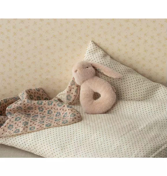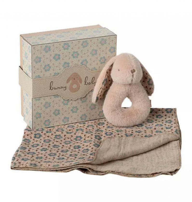 A perfect gift idea for the little ones. The set includes a soft cotton cloth and a small bunny rattle. The bunny has a small rattle inside that makes a soft sound. It all comes in a beautiful gift box.