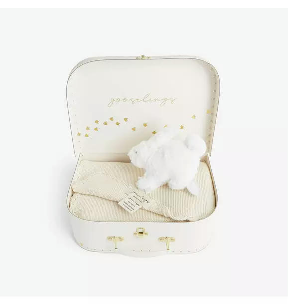 This Cozy Gift Box includes a beautifully crafted cotton knit blanket, a soft lovey, all elegantly packaged in a charming little suitcase perfect for storing toys and heirlooms.
