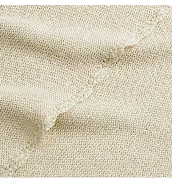 Knit Blanket: 100% cotton with a hand-stitched scalloped pattern. Size: 30” x 40”.