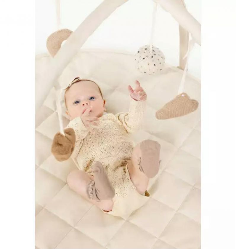 A soft, stationary play space complete with artisanal knit rattles for little ones beginning to explore the world around them.