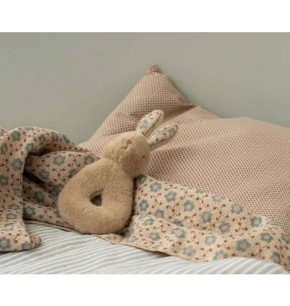 A perfect gift idea for the little ones. The set includes a soft cotton cloth and a small rabbit rattle. The rabbit has a small rattle inside that makes a soft sound. It all comes in a beautiful gift box.
