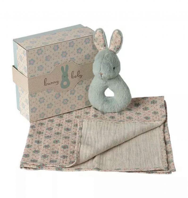A perfect gift idea for the little ones. The set includes a soft cotton cloth and a small rabbit rattle. The rabbit has a small rattle inside that makes a soft sound. It all comes in a beautiful gift box.