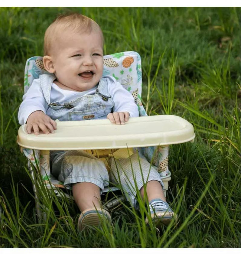 Baby chair and tray with matching carry bag and straps to use as booster seat on dining chair. Keeps your little one snug and secure with the built-in harness.