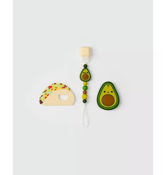 Bundle includes an Avocado teether, a Taco teether, and a coordinating Avocado Darling clip