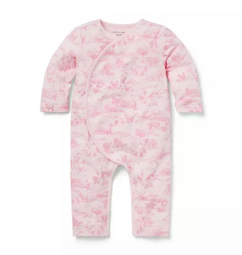 For all of baby's first moments, our farm animal toile one-piece is the perfect choice. Featuring a kimono-inspired wrap silhouette and a little back pocket, just because.