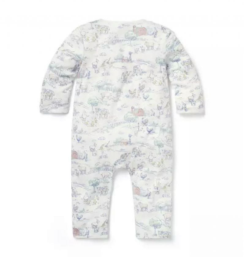 For all of baby's first moments, our farm animal toile one-piece is the perfect choice. Featuring a kimono-inspired wrap silhouette and a little back pocket, just because.