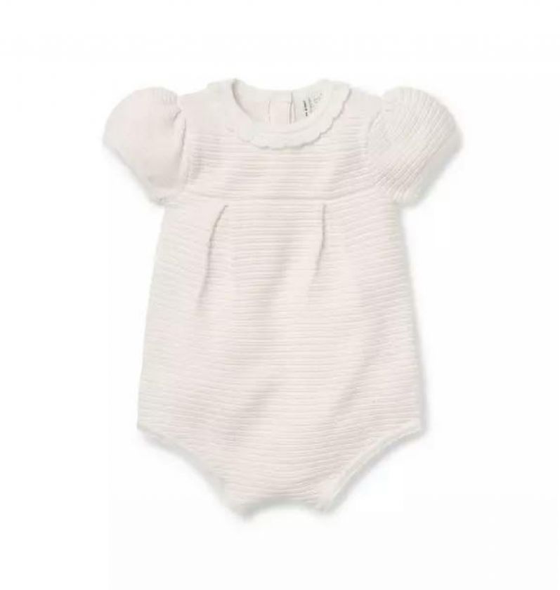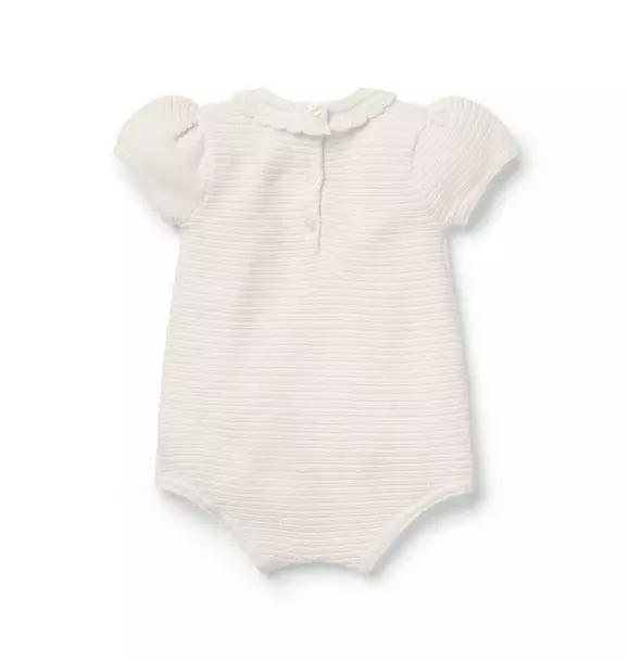 A close-knit favorite perfect for every first. Our romper features allover textured stripes and a crochet collar.