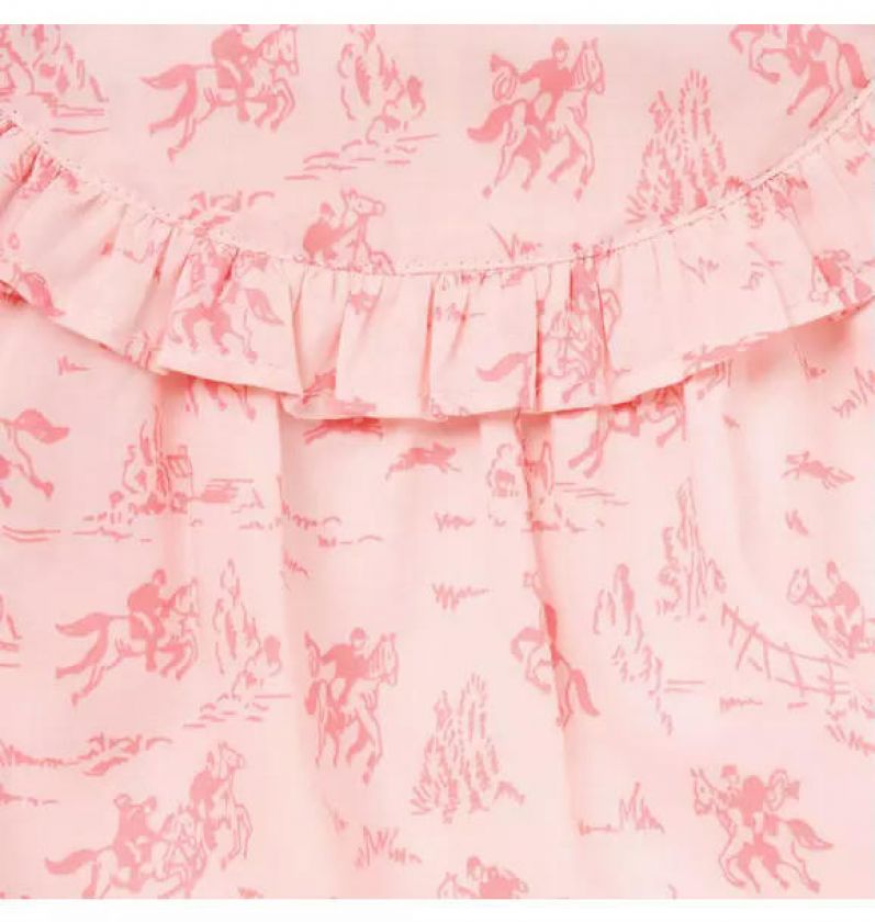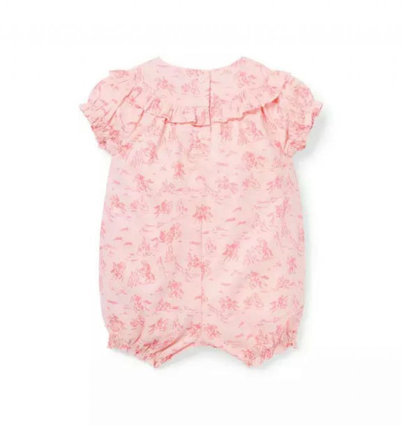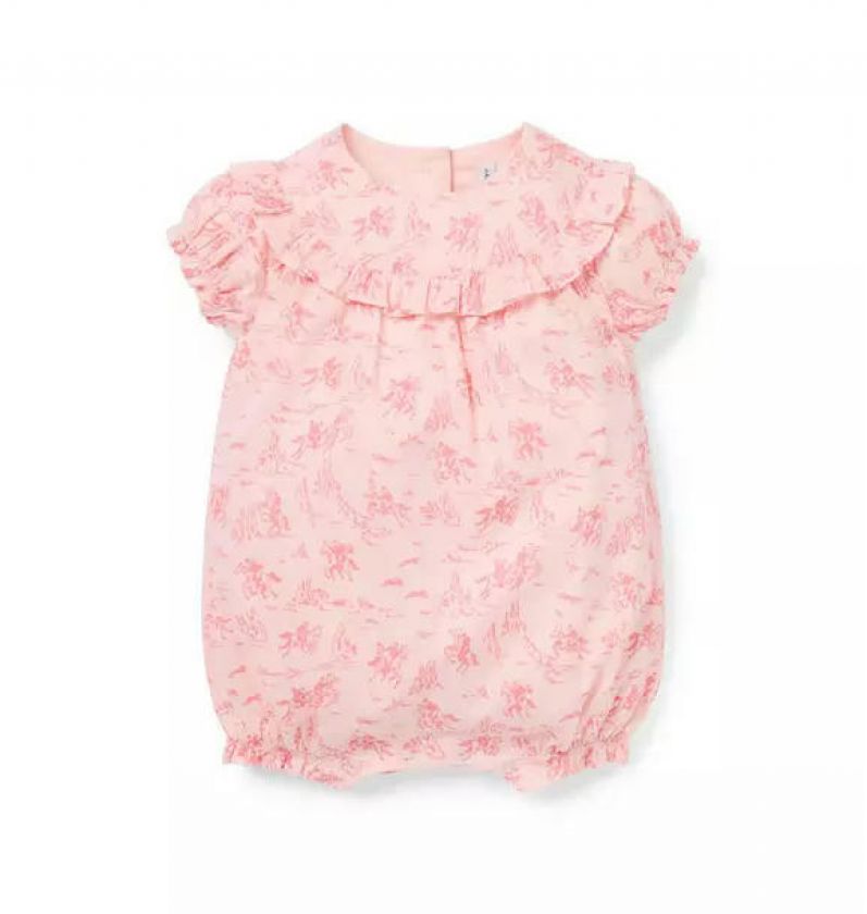 A westward trend for first style moments. Our romper in pure cotton features an allover western toile, puff sleeves and ruffle details.
