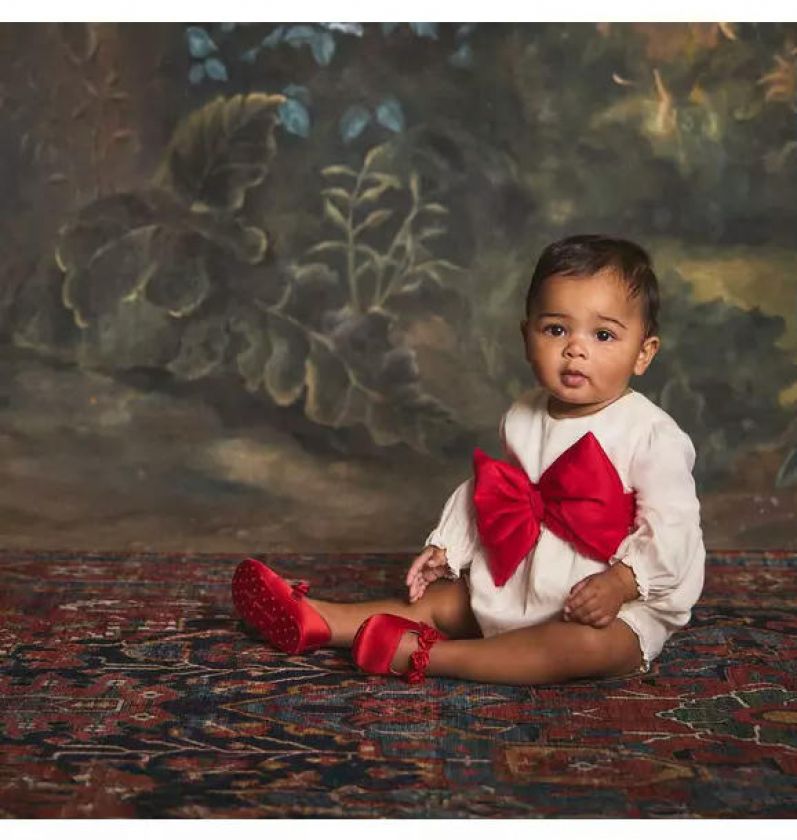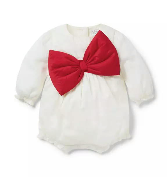 First holiday memories are all wrapped up in a bow with our pure cotton romper. With an oversized bow detail and little ruffles too, it's perfect for holiday photos and special occasions.