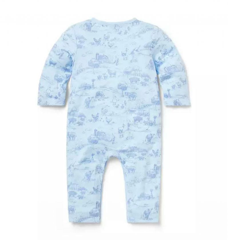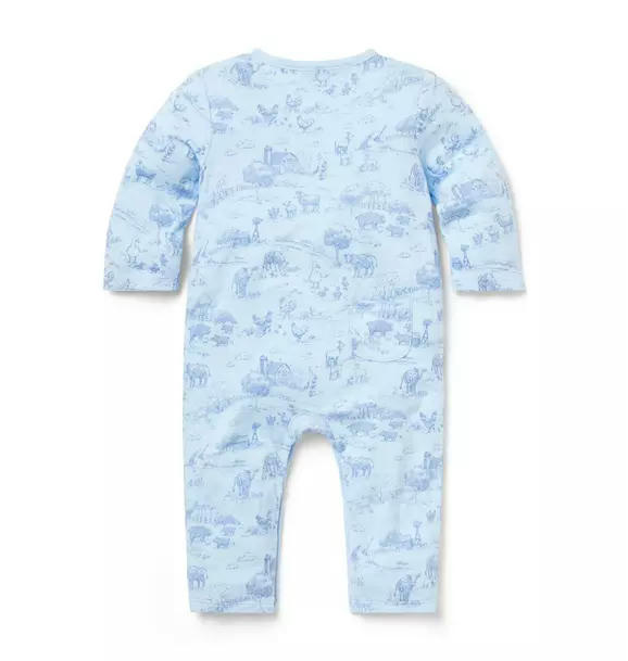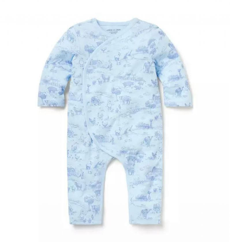 For all of baby's first moments, our farm animal toile one-piece is the perfect choice. Featuring a kimono-inspired wrap silhouette and a little back pocket, just because.