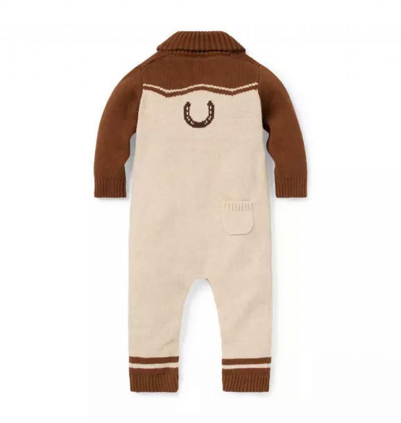 The best of the west for our soft sweater one-piece. Designed in pure cotton with an intarsia-knit sheriff star at the chest and a horseshoe detail at the back. Our signature shawl collar makes it even better.