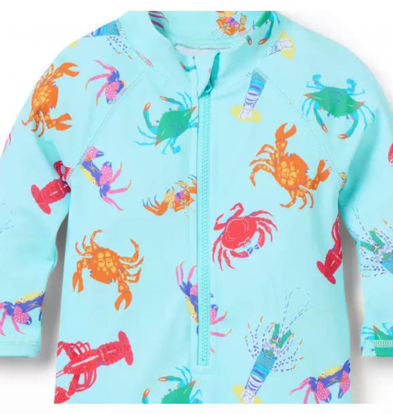 Inspired by tidepool adventures, our rash guard swimsuit is detailed with shellfish friends, raglan sleeves and UPF 50+ sun protection. Responsibly made with recycled polyester fabric.