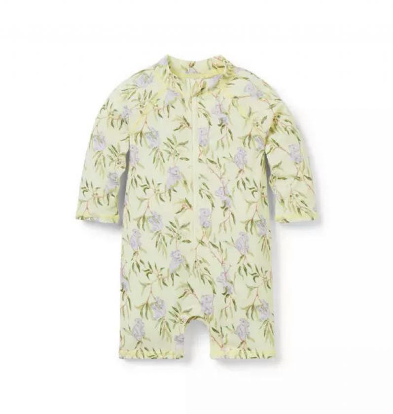 Nothing says first splashes like our rash guard swimsuit with an allover koala print. We love its raglan sleeves and zip front, plus UPF 50+ sun protection for all their adventures. Responsibly made with recycled polyester fabric.