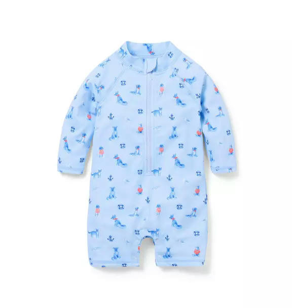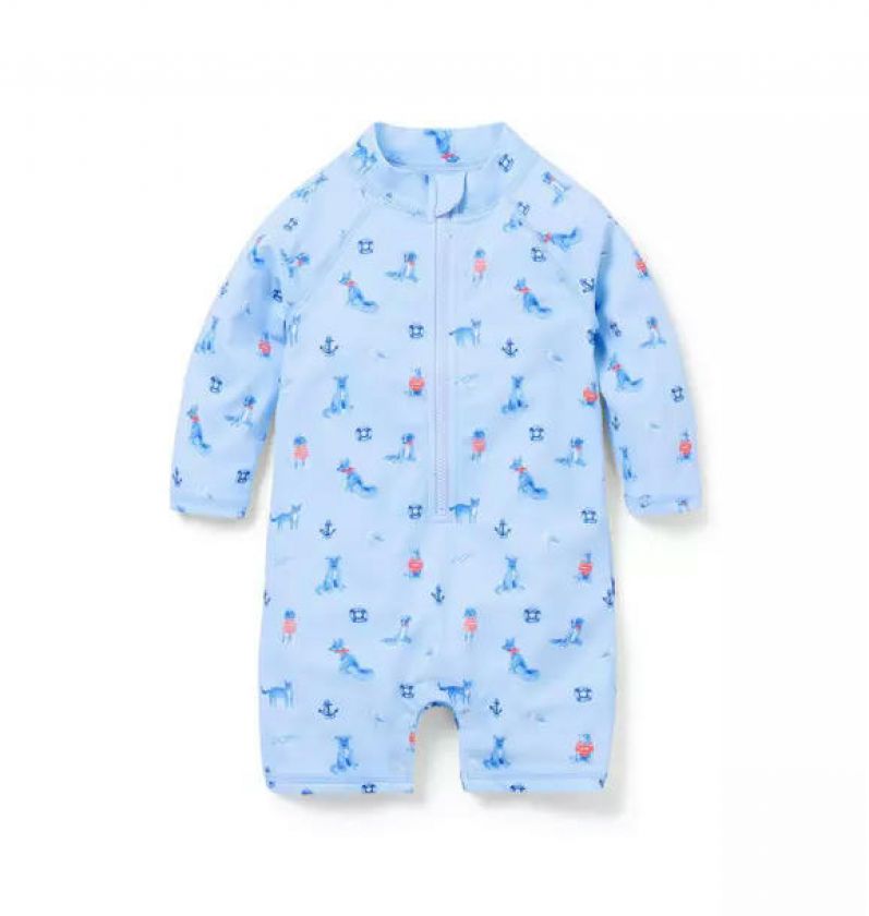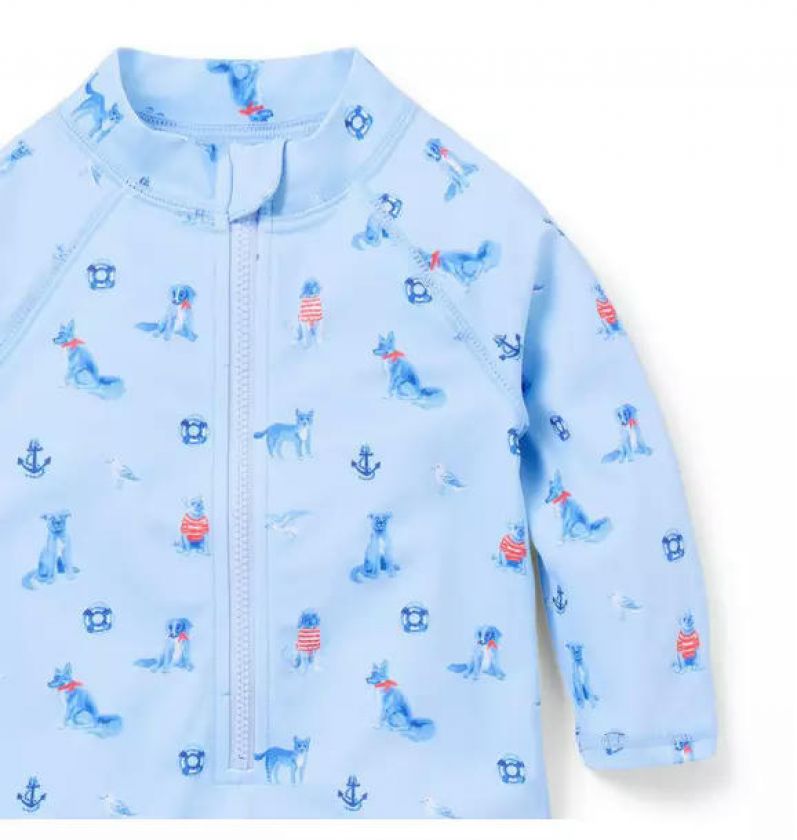For shipshape style at the beach or the pool, our rash guard swimsuit is just the thing. With an allover nautical dog print, plus UPF 50+ sun protection to help keep them stylishly safe. Responsibly made with recycled polyester fabric.