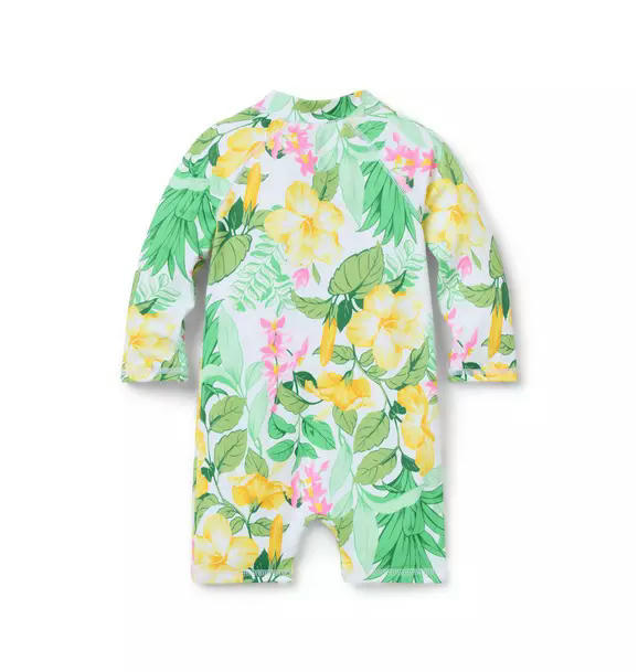 For fashionable first splashes, our tropical floral rash guard swimsuit is just the thing. With raglan sleeves and a zip front, plus UPF 50+ sun protection for all of baby's adventures. Responsibly made with recycled polyester fabric.